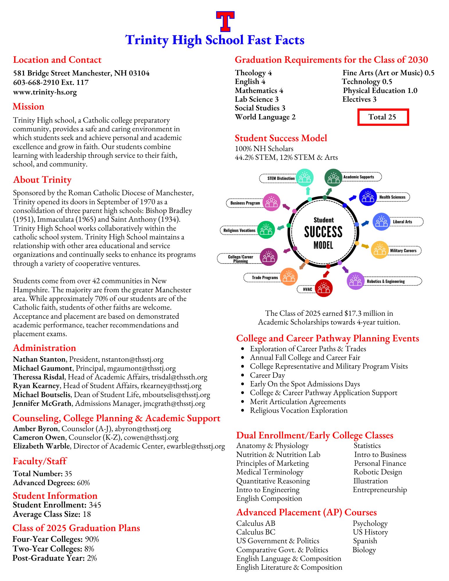 Trinity High School, a Catholic, co-educational secondary school located in Manchester, New Hampshire. Trinity provides a safe and caring environment in which students seek and achieve personal and academic excellence and grow in faith. Our students combine learning with leadership through service to their faith, school, and community.